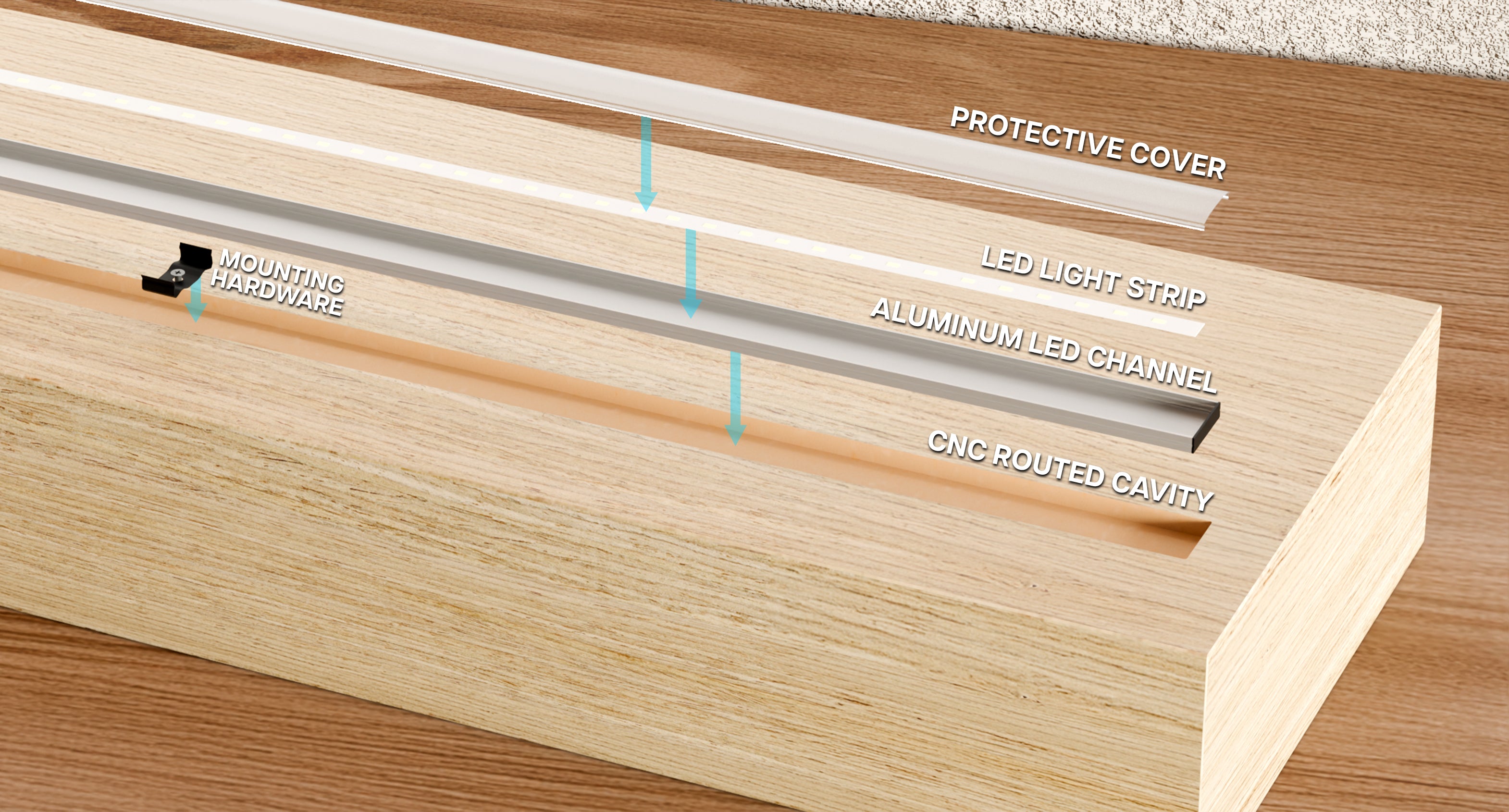 Our floating shelves aren’t just for storage. They are designed to elevate your entire space with built-in LED lighting. By pairing premium 24-volt LED strip lighting with aluminum channels and dimmable drivers, you get a sleek long-lasting and customizable glow that makes your shelves stand out day or night.